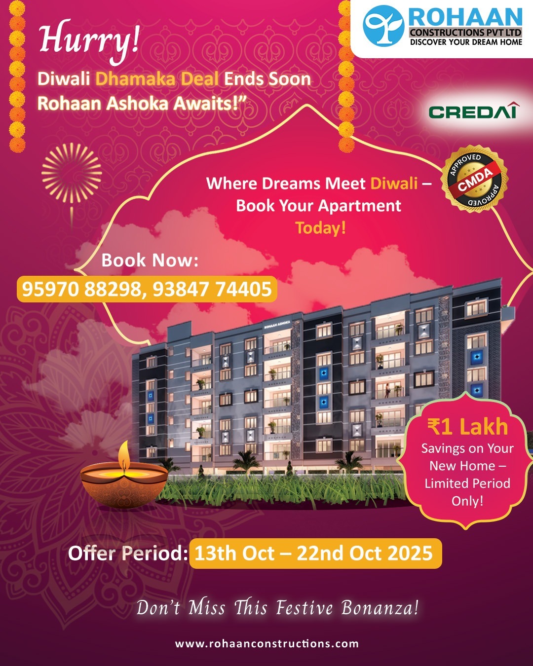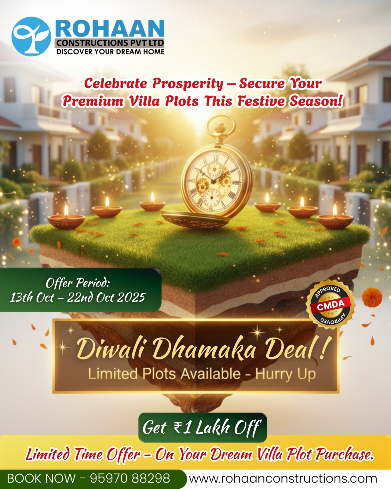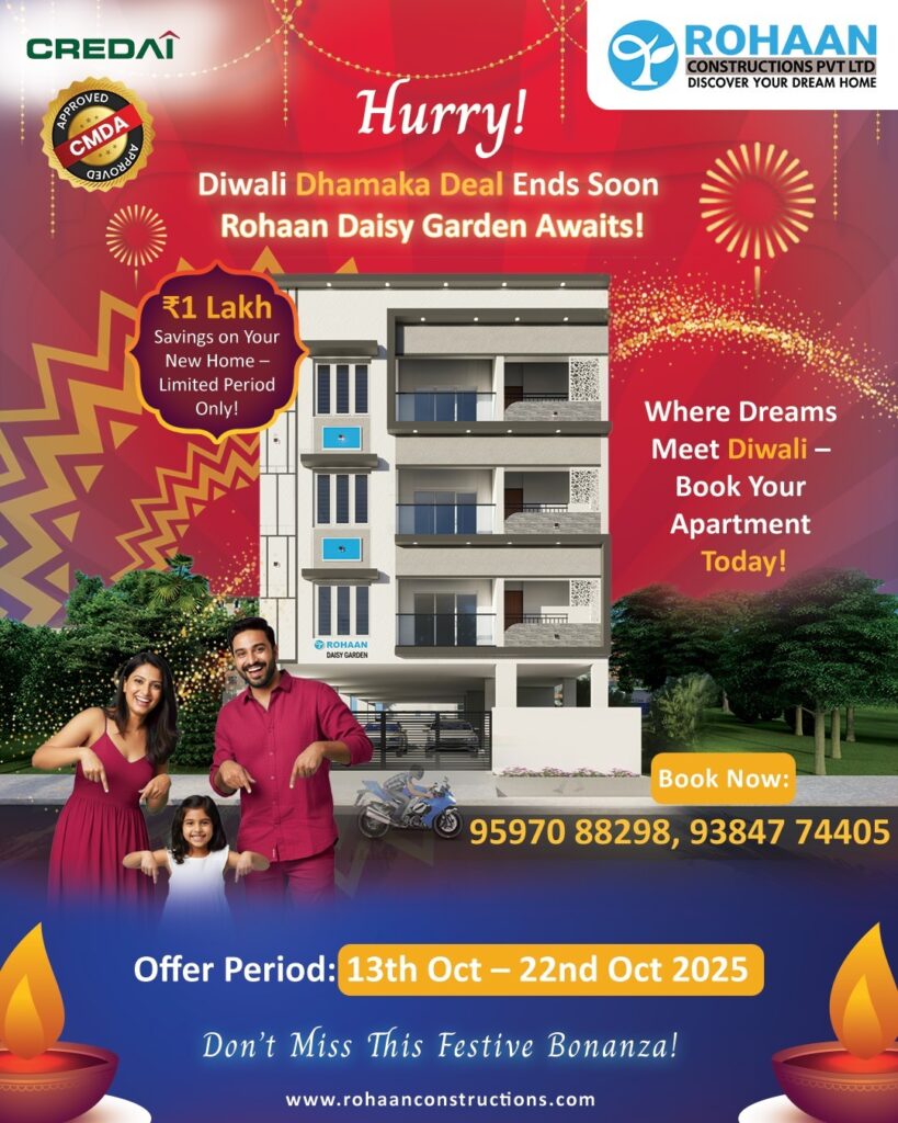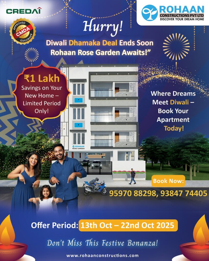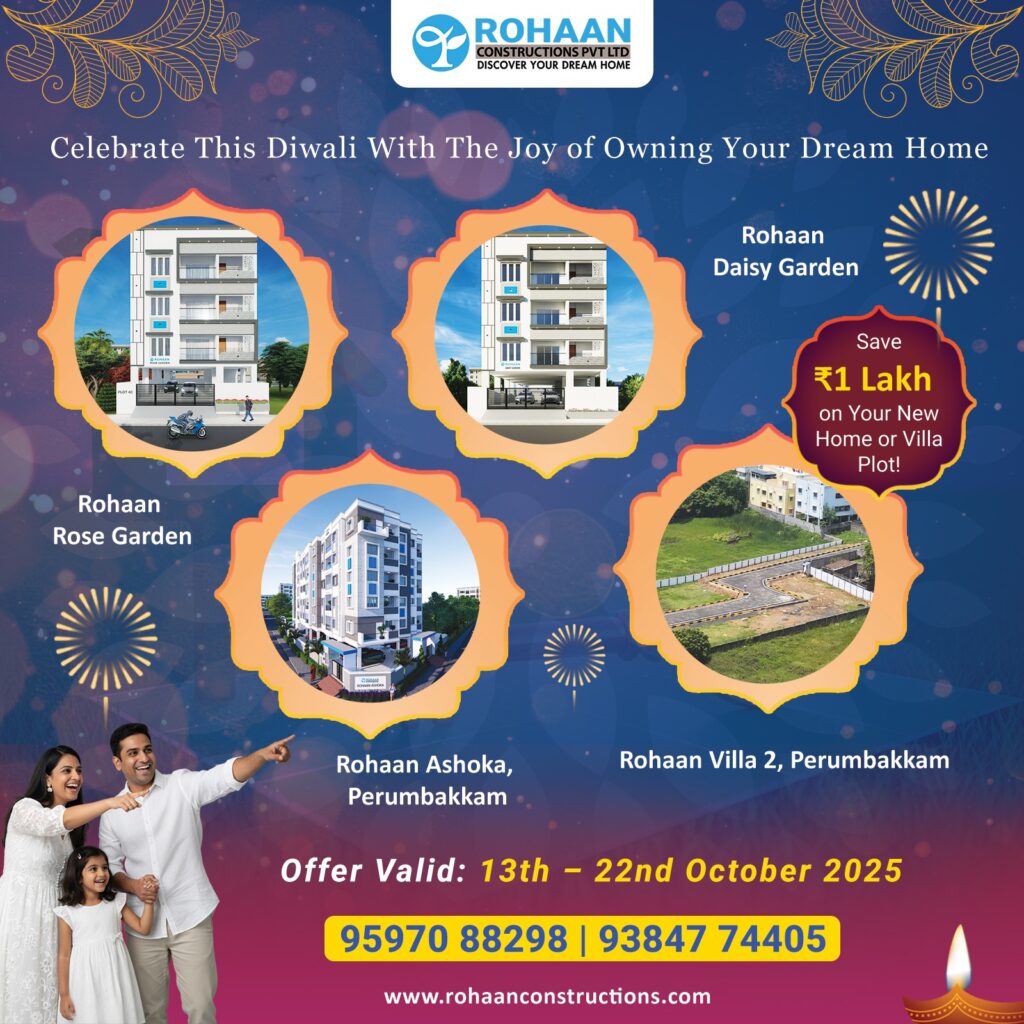 This Diwali, let the light of new beginnings shine through your dream home. Rohaan Constructions brings you an exclusive Festive Offer Save ₹1 Lakh on select apartments and villa plots in Perumbakkam and Medavakkam